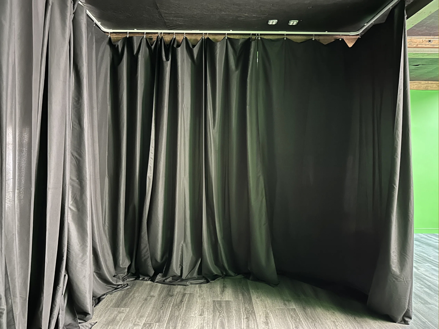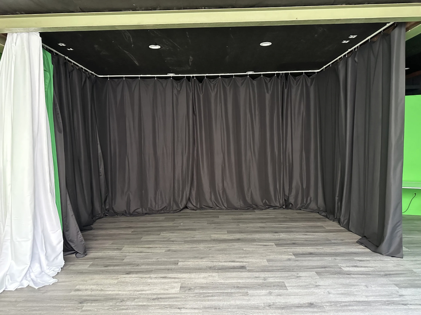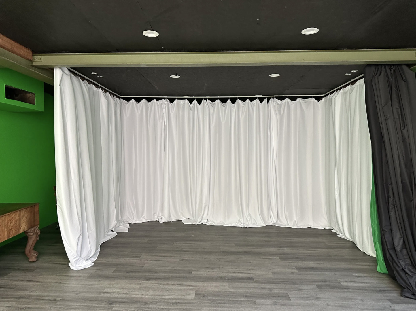 - 40 ft wrap around 10 ft edges in white or black curtain for single or multiple person interviews, photo or filming needs.