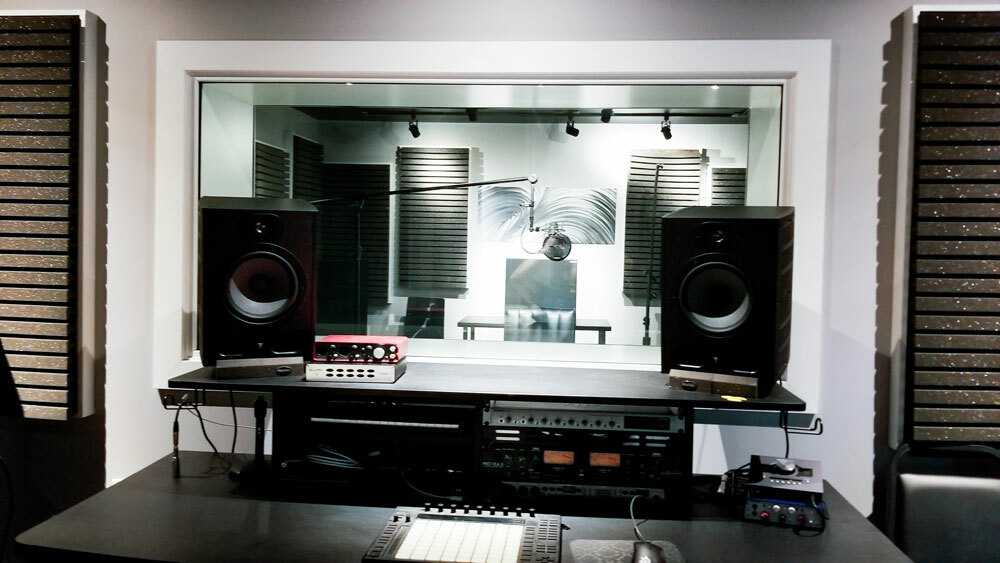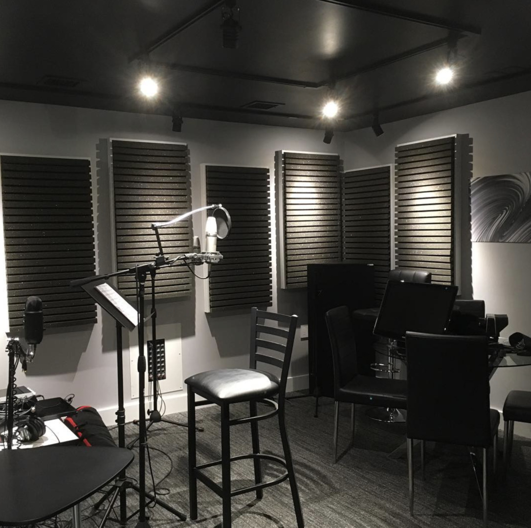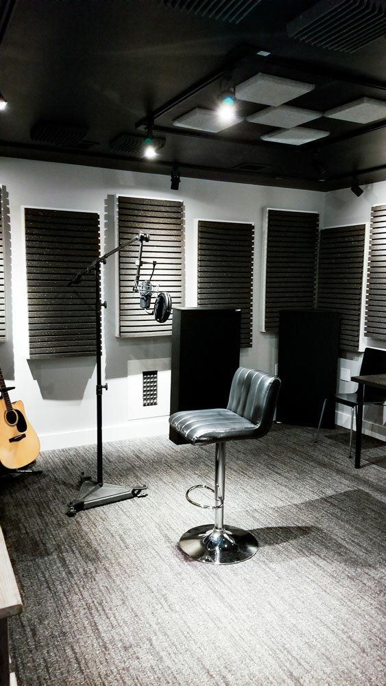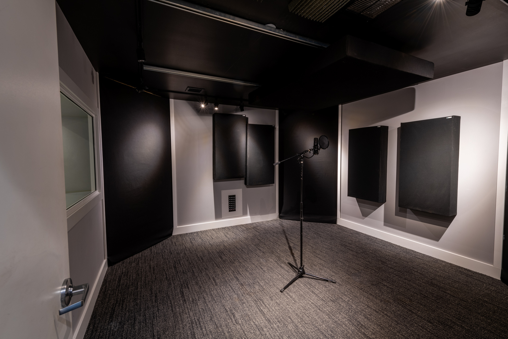 - Soundproof studio with industry-standard equipment including headphones, microphones, mixers, and pop filters.