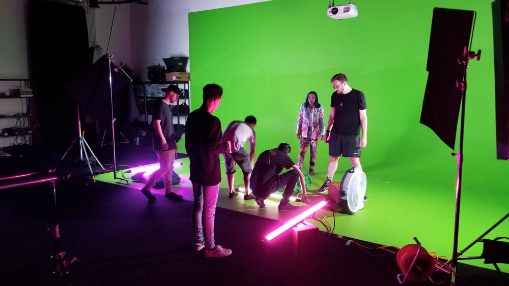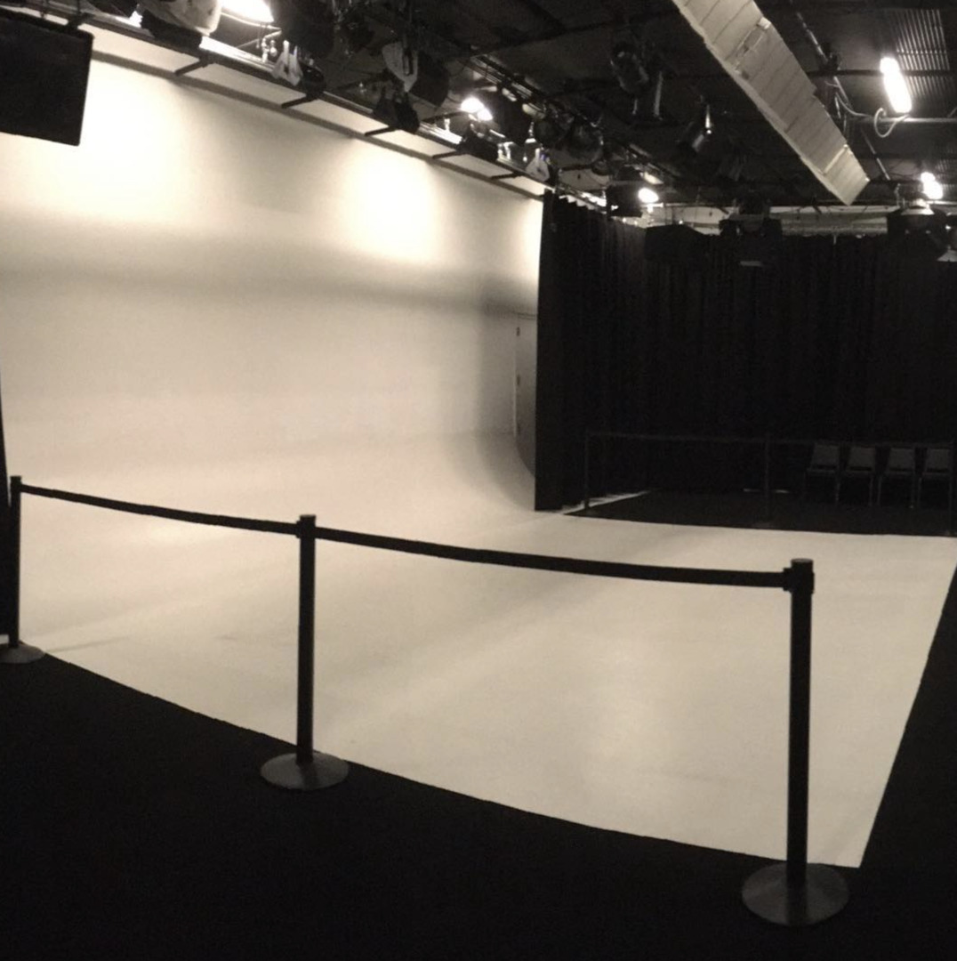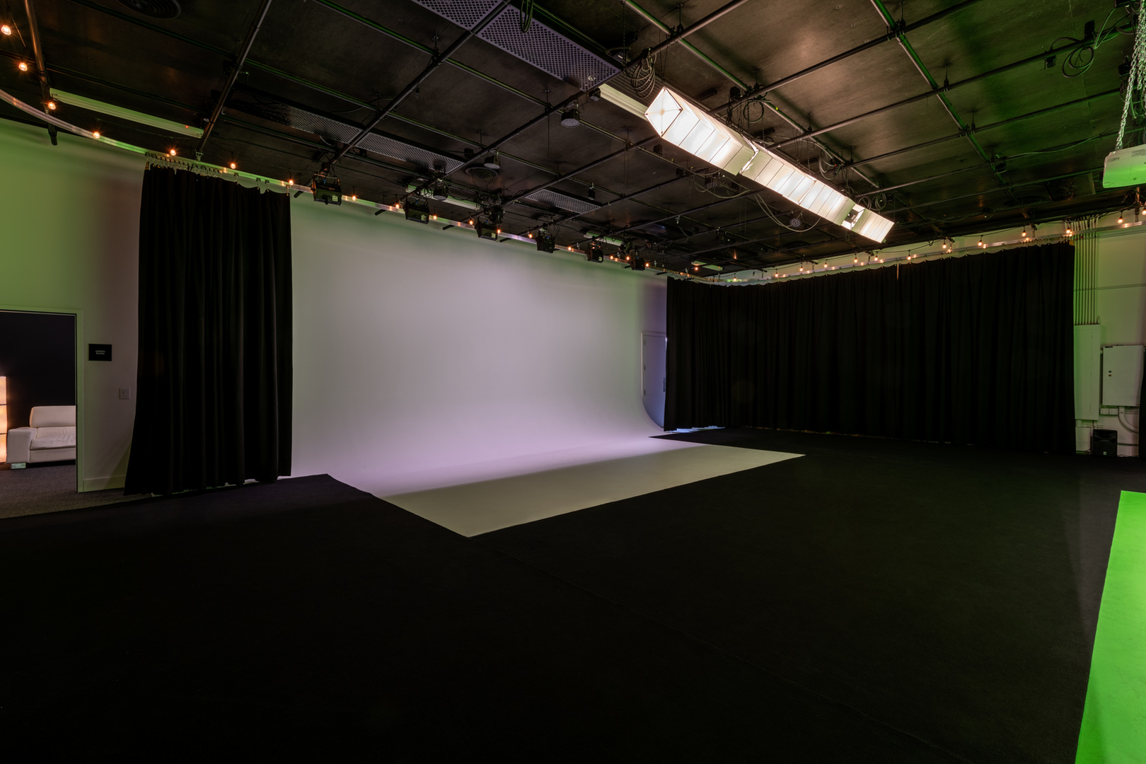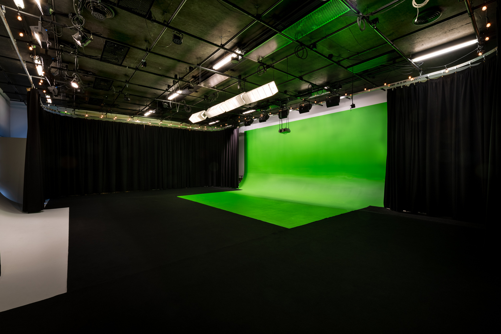 - Sound stage with cycloramas and green screen for chromakey editing.