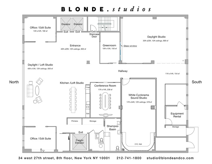 - North + South daylight studios (blackout capable), white cyc, and rooftop access